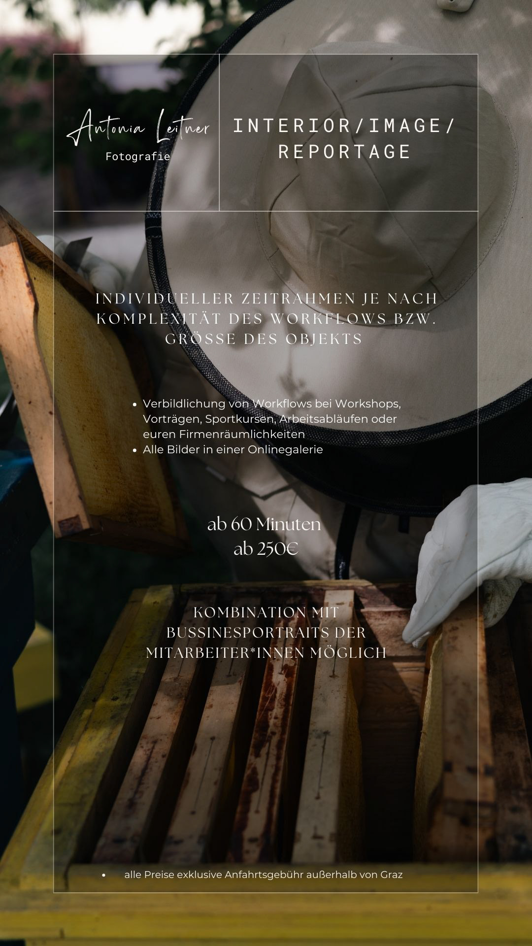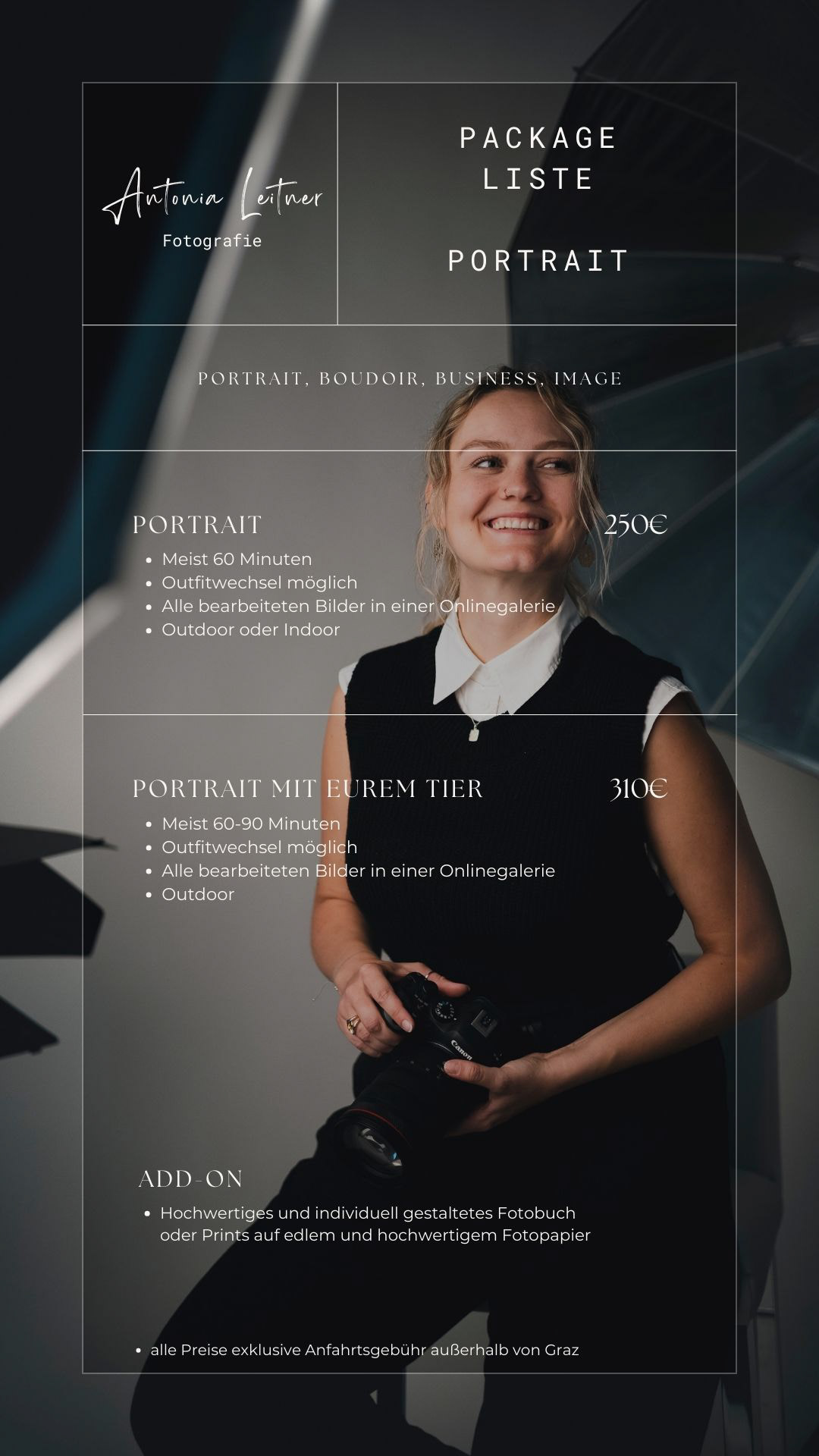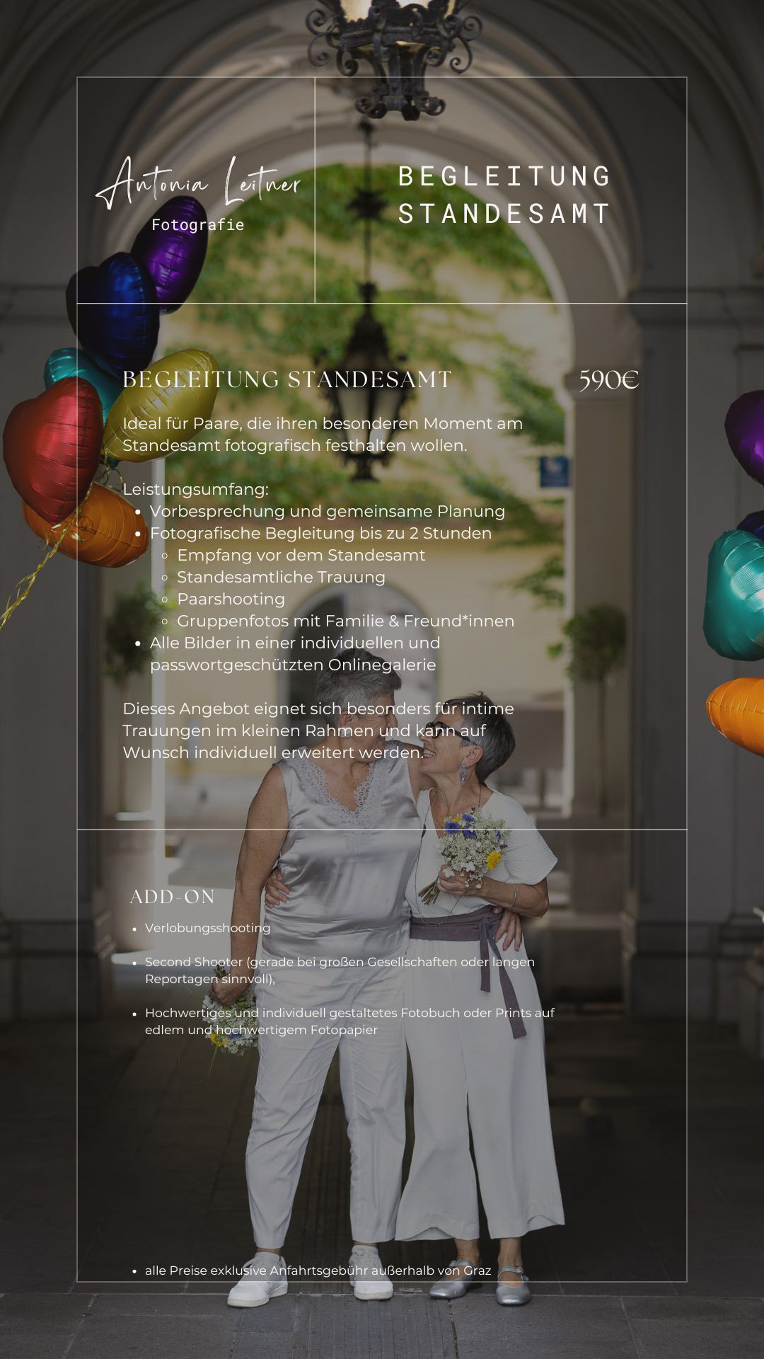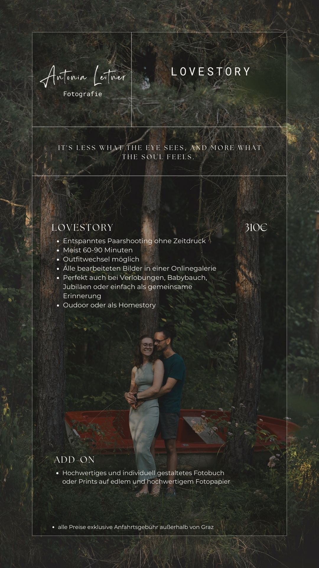 Alle Preise sind bei mir transparent und ohne versteckte Kosten. Die fotografische Begleitung, die sorgfältige Auswahl und Bearbeitung der Bilder sowie eure persönliche, passwortgeschützte Onlinegalerie sind bereits im Preis inkludiert. Ihr investiert bei mir nicht in eine bestimmte Anzahl an Bildern, sondern in eine stimmige fotografische Geschichte.